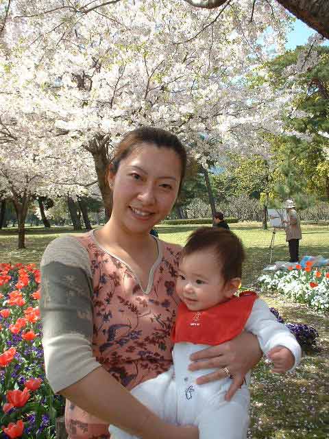 We checked and headed back toward the eki where we stocked on some snacks while Youki elicited constant cries of kawaii! from the local populace. One of the really fortunate parts of this tour was that the preceding couple of weeks had been extremely coll for the time of year and that had preserved the cherry blossoms past their usual date. So we trundled up to Beppu koen (park) and had a lovely morning tea under the blossoms - Youki's first o hanami (see photo) and our first for several years.